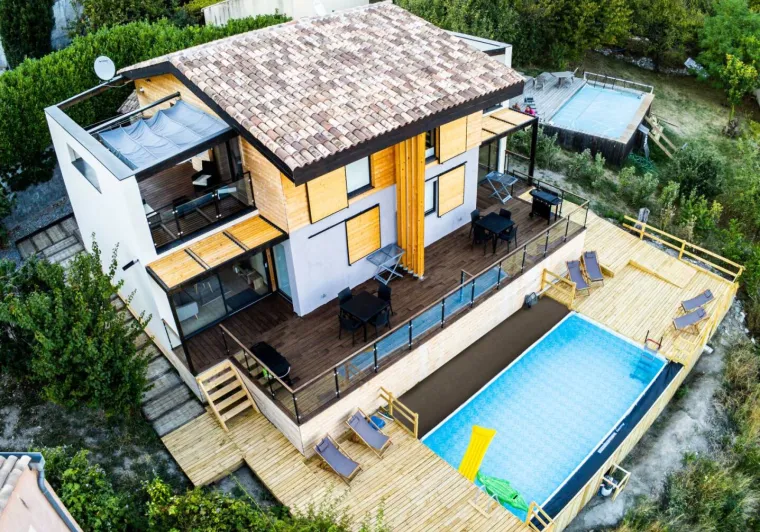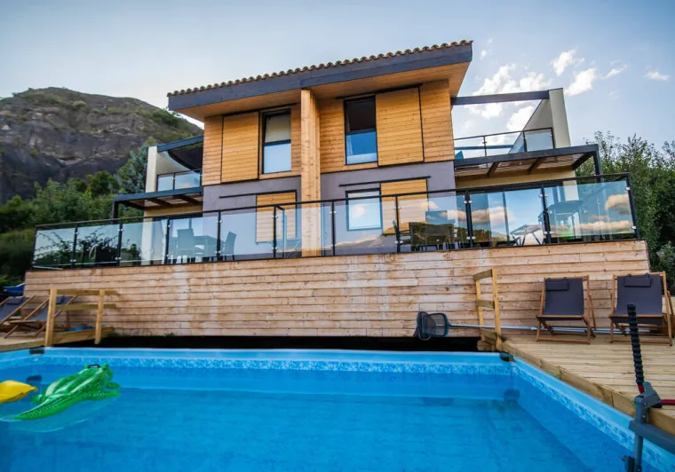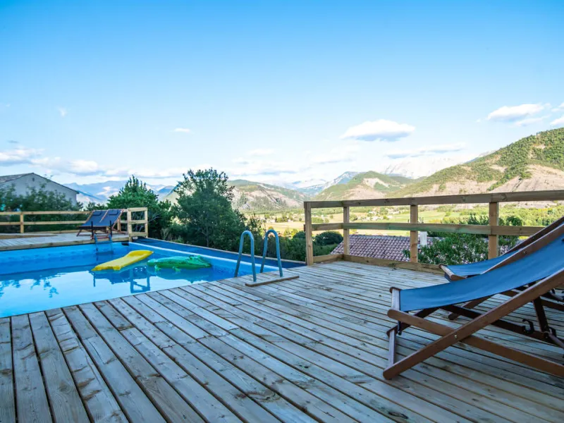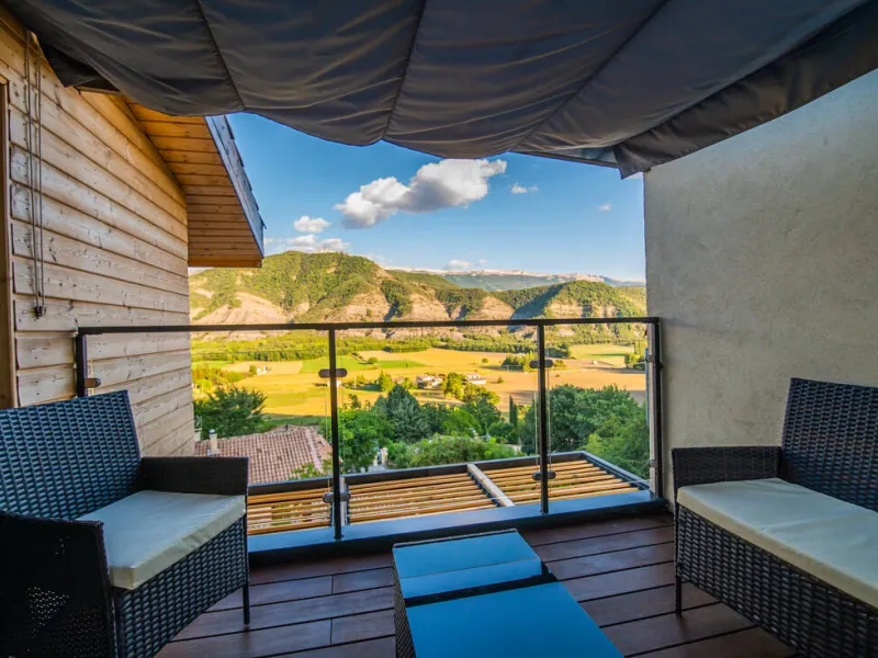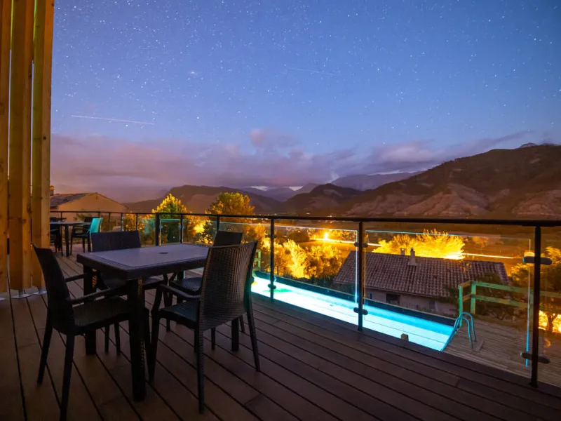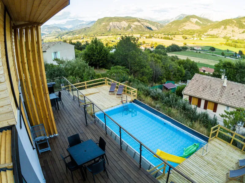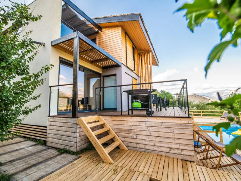 Nouvelle construction de 2021 sur pilotis avec des matériaux écologiques (bois, chaux, argile, liège, …).Vue panoramique sur le Cheval Blanc, pic du Couard, Barre des Dourbes...