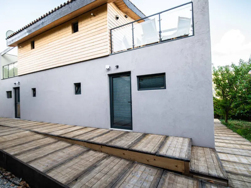 Piscine mitoyenne mais avec une plage privée de 20 m2.