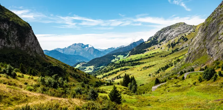 .Der letzte große Pass auf der Route des Grandes Alpes®: La Colombière (1613 m). Der Anstieg beginnt, nachdem Sie das Dorf Le Grand-Bornand durchquert haben. Die ersten Kilometer führen Sie ohne große Schwierigkeiten nach Le Grand-Bornand Chinaillon. Es folgen einige Kilometer eines kaum härteren Anstiegs bis zum Pass, dem Wendepunkt zum Arve-Tal. Genießen Sie das herrliche Panorama auf das Aravis-Massiv und die Bargy-Kette, bevor Sie sich in die Abfahrt stürzen. Auf halbem Hang, von Le Reposoir aus, ist eine Variante über das Dorf Romme oberhalb von Cluses und dem Arve-Tal möglich.