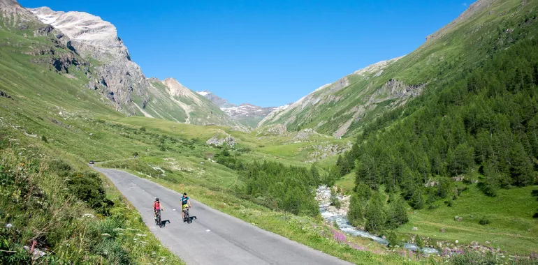 Von Tignes Val Claret aus führt die Route durch einen Teil des Skigebiets Tignes - Val d'Isère. So umgehen Sie in einer wilden und spektakulären Umgebung den gesamten, wenig angenehmen und von Tunneln durchzogenen Straßenabschnitt, der den Chevril-Staudamm und den gleichnamigen See mit Val-d'Isère verbindet. Aber Vorsicht: Wenn Sie Zweifel an Ihrer körperlichen oder technischen Leistungsfähigkeit oder am Wetter haben, fahren Sie lieber über die Route D902 nach Val d'Isère. Fahren Sie auf der Straße weiter, um den sagenhaften Anstieg und die nicht weniger spektakuläre Abfahrt vom Col de l'Iseran (2764 m) bis nach Bonneval-sur-Arc zu bewältigen, einem schönen Dorf mit Schieferdach, dem Aushängeschild von Haute-Maurienne Vanoise. Von Bonneval aus erreichen Sie Bessans über den Chemin du Petit Bonheur, der sehr rollend und perfekt für Schotter geeignet ist.